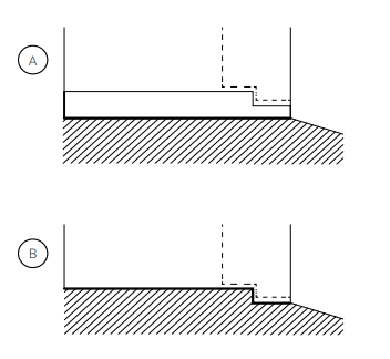 Placera alltid karmen på en fuktspärr t.ex. tjärpapp. Kontrollera att överstycket är i våg. Karmen monteras valfritt enligt bild A alt. B. Karm som monteras enligt bild A är att