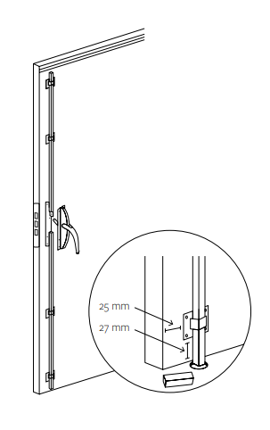 På insidan av det passiva dörrbladet skall den medlevererade garageregeln monteras. Regelns handtag placeras enligt bild, 25 mm