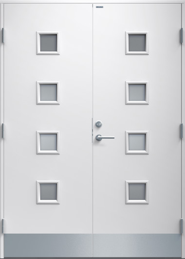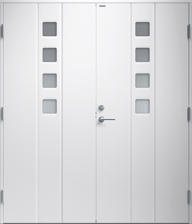 Parytterdörr i modern stil med slät yta utan dekor. Fyra små, kvadratiska klarglas per sida och rostfri sparkplåt.