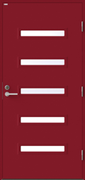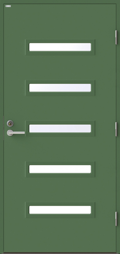 En dörr i modern stil med fem horisontella klarglas. Insidan är falsad, alltså en helt slät insida utan lister.