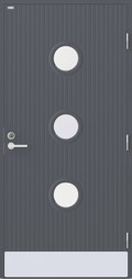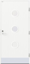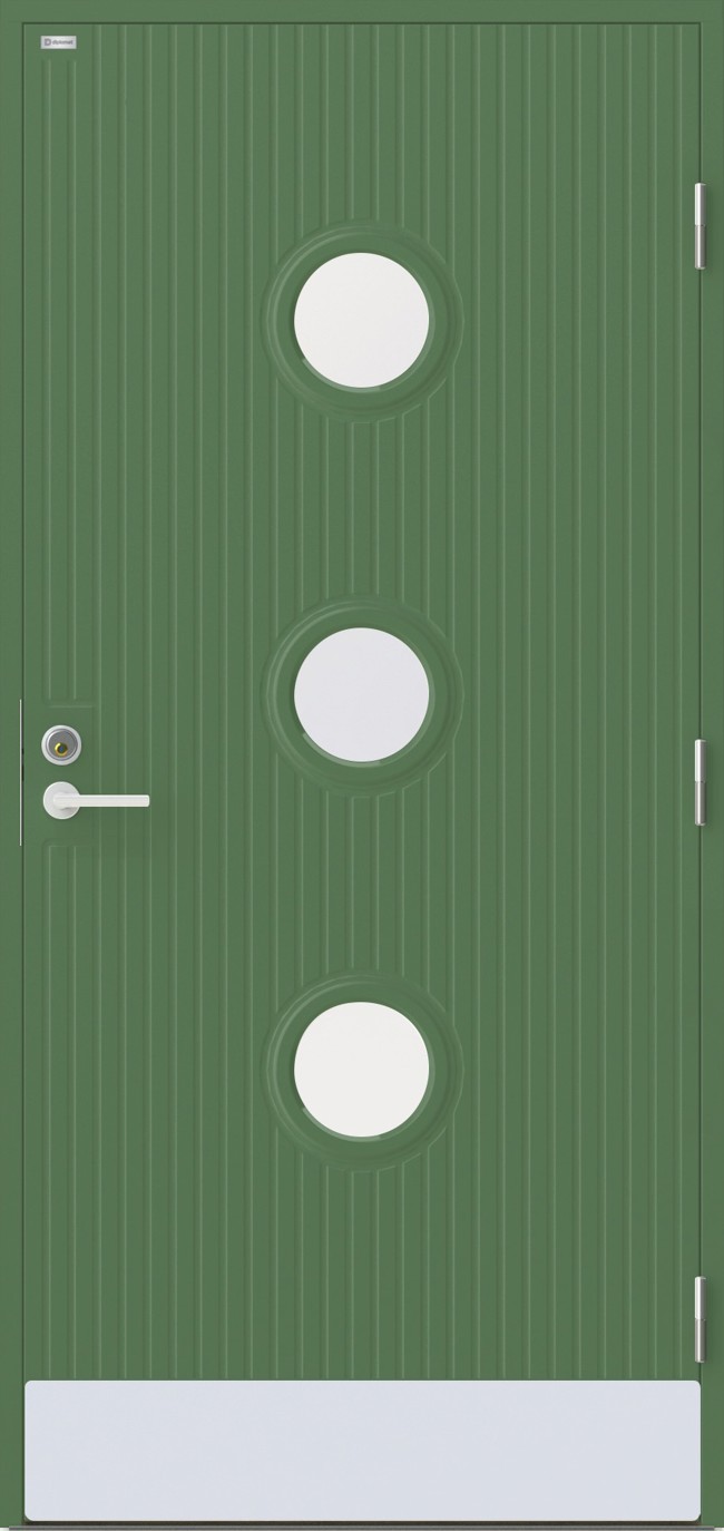 En dörr i modern stil med runda klarglas. Djupa stående dekorspår och en sparkplåt i aluminium.