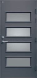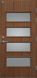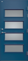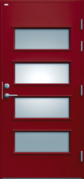 Elegant ytterdörr helt utan dekor. Dörren har fyra lite större, liggande klarglas. Välj mellan valfri kulör, konstteak eller ek.