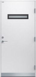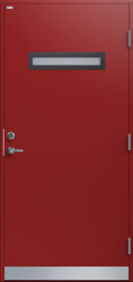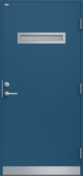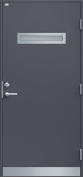Ytterdörr i modern stil utan dekor, försedd med liggande steppat klarglas med limmad glaskassett. Välj mellan glasram i svart eller silver. Rostfri sparkplåt medföljer. Byggd på laminatskiva som är mer väderbeständig och formstabil.
