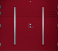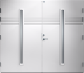 Garagedörr i modern stil med sparsam dekor. Två smala, stående klarglas.
