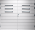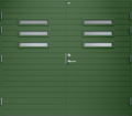 Garagedörr i modern stil med tre horisontella klarglas per sida. Spårfräst dekor i form av liggande panel. Finns i valfri kulör.
