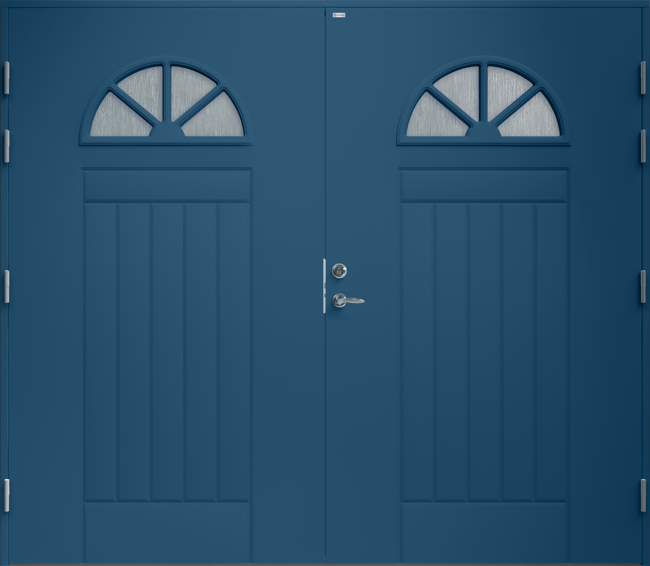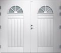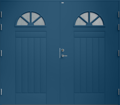Garagedörr i klassisk stil med spårfräst dekor samt två halvcirkelformade cotswoldglas med dekorspröjs.