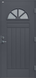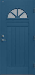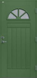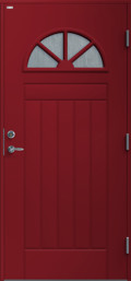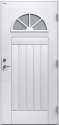 Ytterdörr i klassisk stil med spårfräst dekor samt halvcirkelformat cotswoldglas med dekorspröjs.