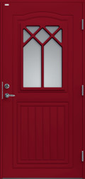 Ytterdörr i traditionell stil och klarglas med karakteristiska dekorspröjs.