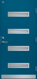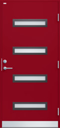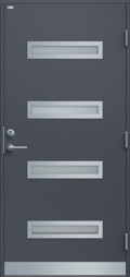 Ytterdörr i modern stil utan dekor. Byggd på laminatskiva som är extra väderbeständig och formstabil. Fyra liggande klarglas i steppat utförande med limmad glaskassett, välj mellan glasram i svart eller silver. Rostfri sparkplåt.