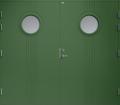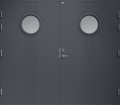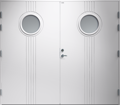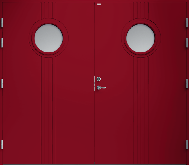 Garagedörr i traditionell stil med spårfräst dekor och två runda klarglas.