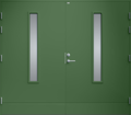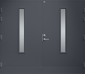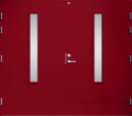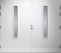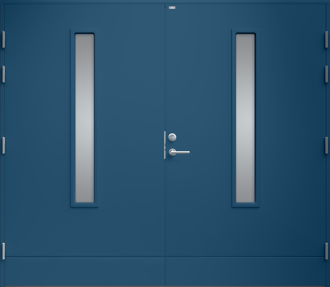 Garagedörr i modern stil med enkelt dekorspår i nederkant och två smala, stående klarglas. Finns i valfri kulör.